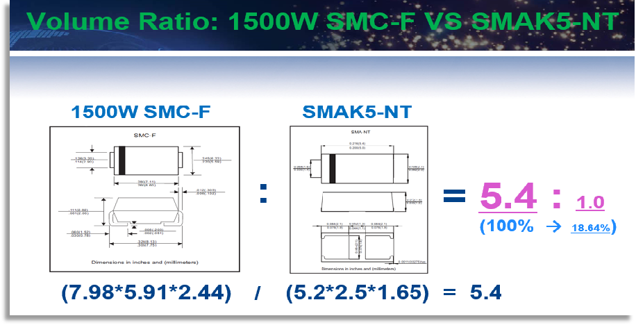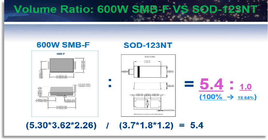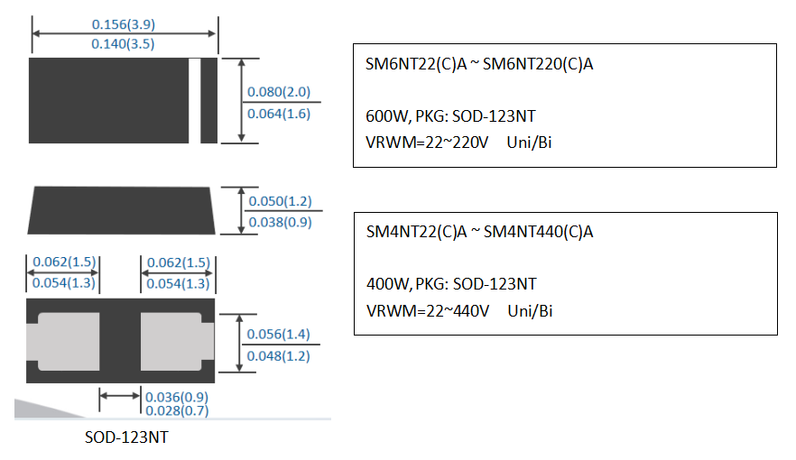 3、封裝SMA-NT以及SOD-123NT 在相同功率的情況下,產(chǎn)品體積減少5倍以上。