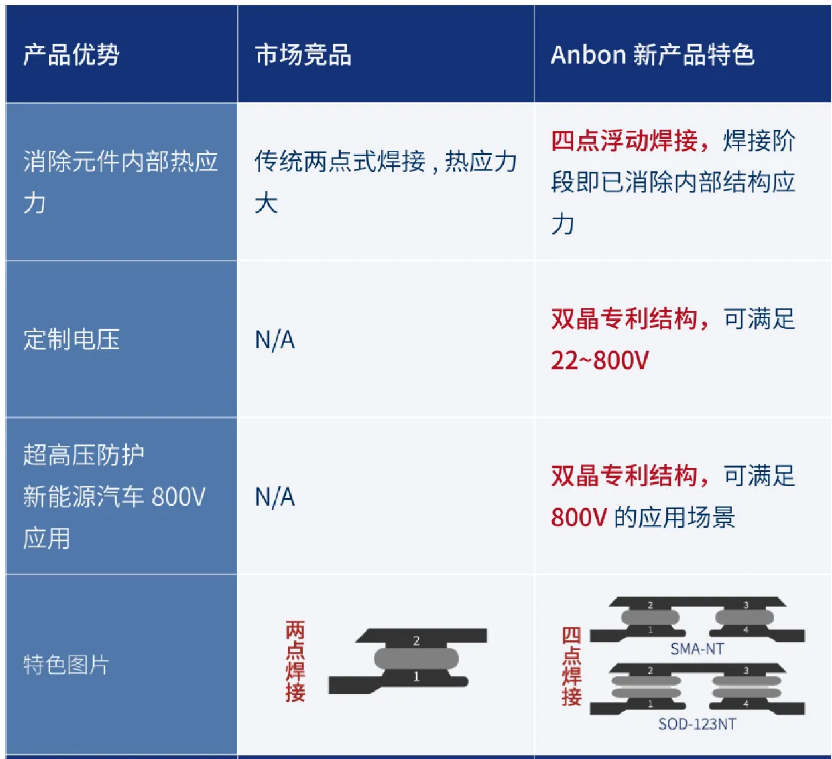 其中安邦半導體創(chuàng)新專利:小封裝大功率TVS,其優(yōu)勢如下: