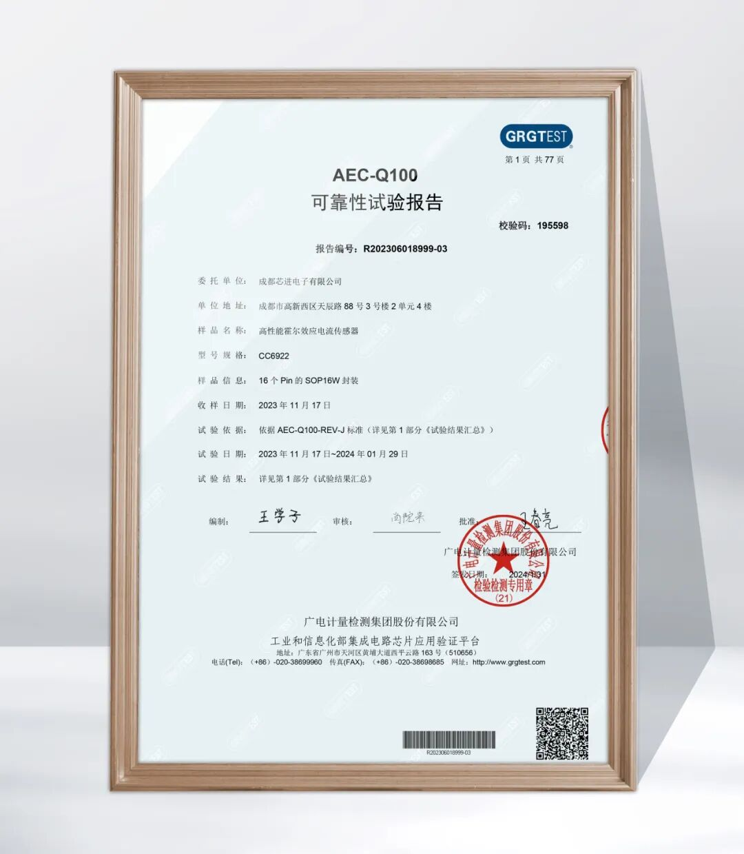 近日,芯進電子推出的高性能電流傳感器CC6922,順利通過廣電計量平臺AEC-Q100車規級可靠性認證。